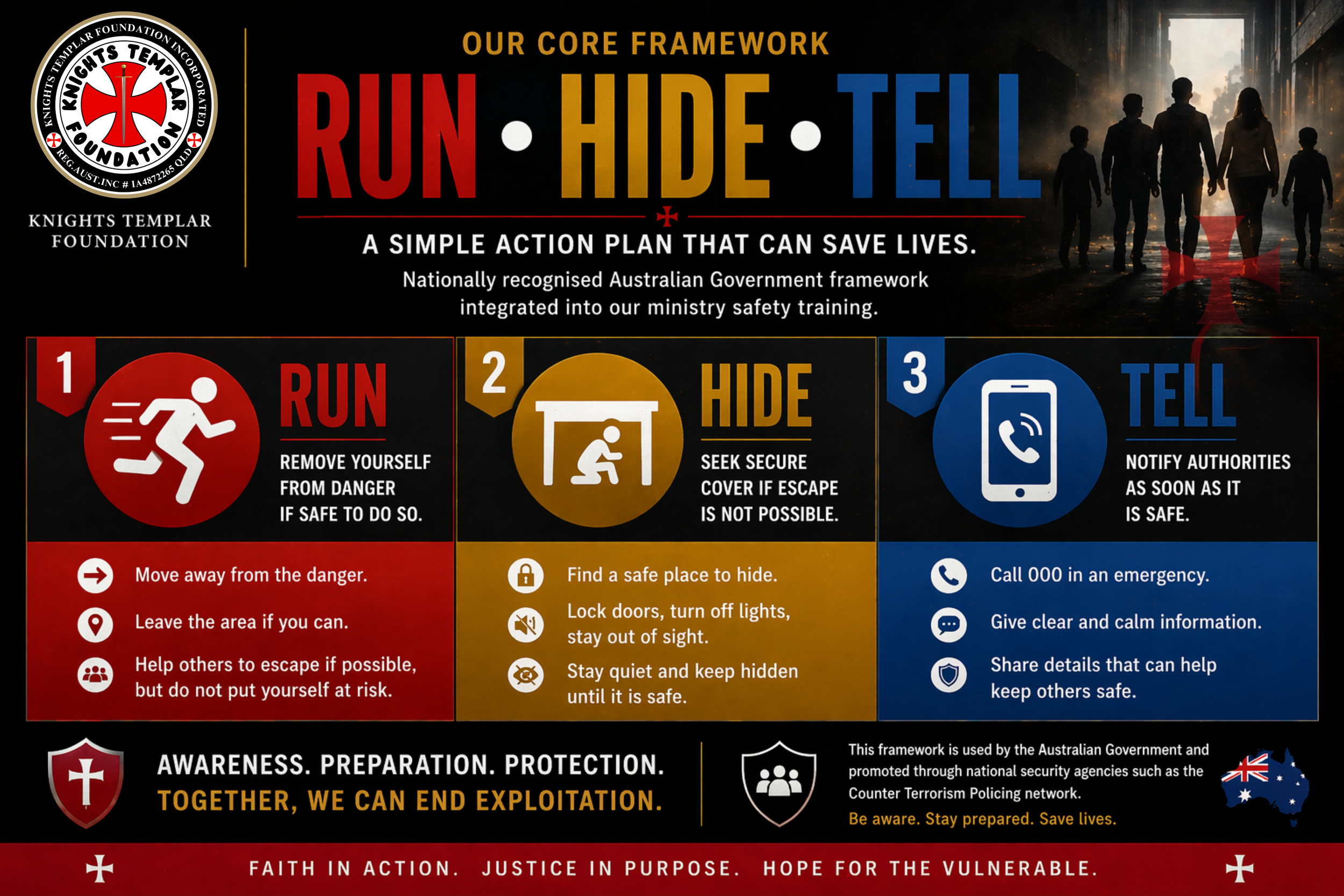 The Run • Hide • Tell framework is a simple, nationally recognised safety model designed to guide individuals during a hostile or life-threatening situation.
